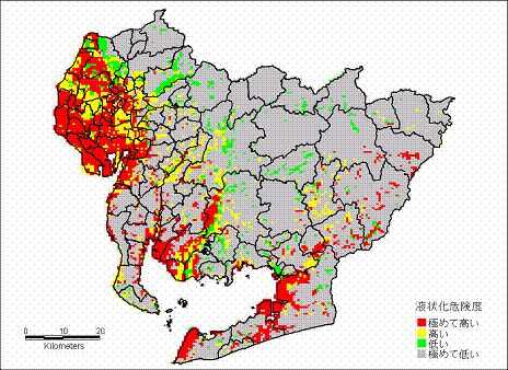 想定東海地震と想定東南海地震を合わせたような分布で、約4分の1の山崖が「危険性が高い」となる。