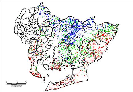 渥美半島の西端、東部から豊橋市にかけて、県東部の山地に入り込む河川沿い、また岡崎平野一帯、知多半島の一部、名古