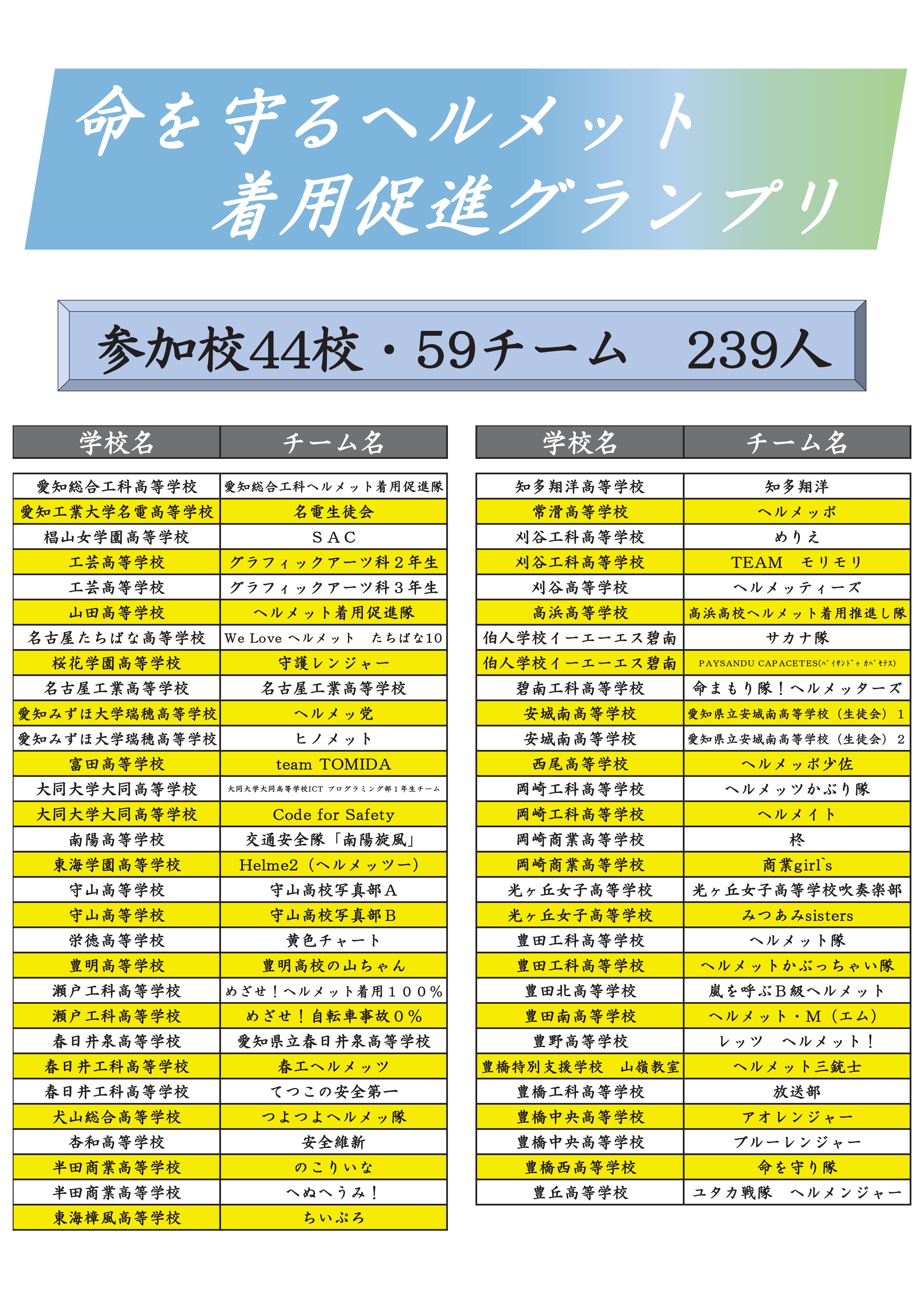 命を守るヘルメット着用促進グランプリチラシ グランプリ参加校・チーム一覧