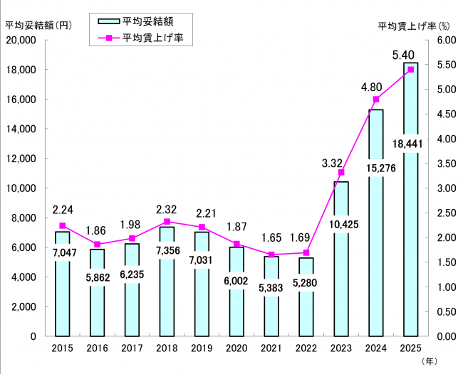 ○ 平均妥結額は、加重平均で調査を開始した1990年以降で最も高い水準となり、