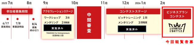 この度、本プログラムの中間審査選抜者が、投資、事業提携へ繋げることを目的に、外部の方に対しピッチを行う場として、2026年2月10日(火曜日)にビジネスプランコンテストを開催します。つきましては、ビジネスプランコンテストの観覧者を募集しますのでお知らせします。事業会社、ベンチャーキャピタル、金融機関、スタートアップ等の皆様は、是非御参加ください。