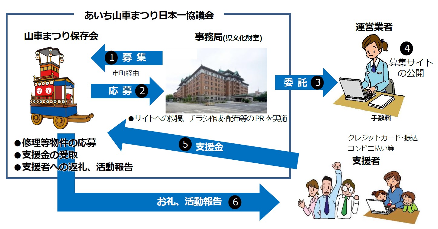 あいち山車まつり日本一協議会(会長 大村秀章愛知県知事)では、山車まつりの保存継承のため、構成団体の内、山車や祭礼用具等の保存修理を行う保存団体に対して、2017年度からクラウドファンディングを活用した資金調達の支援を行っています。