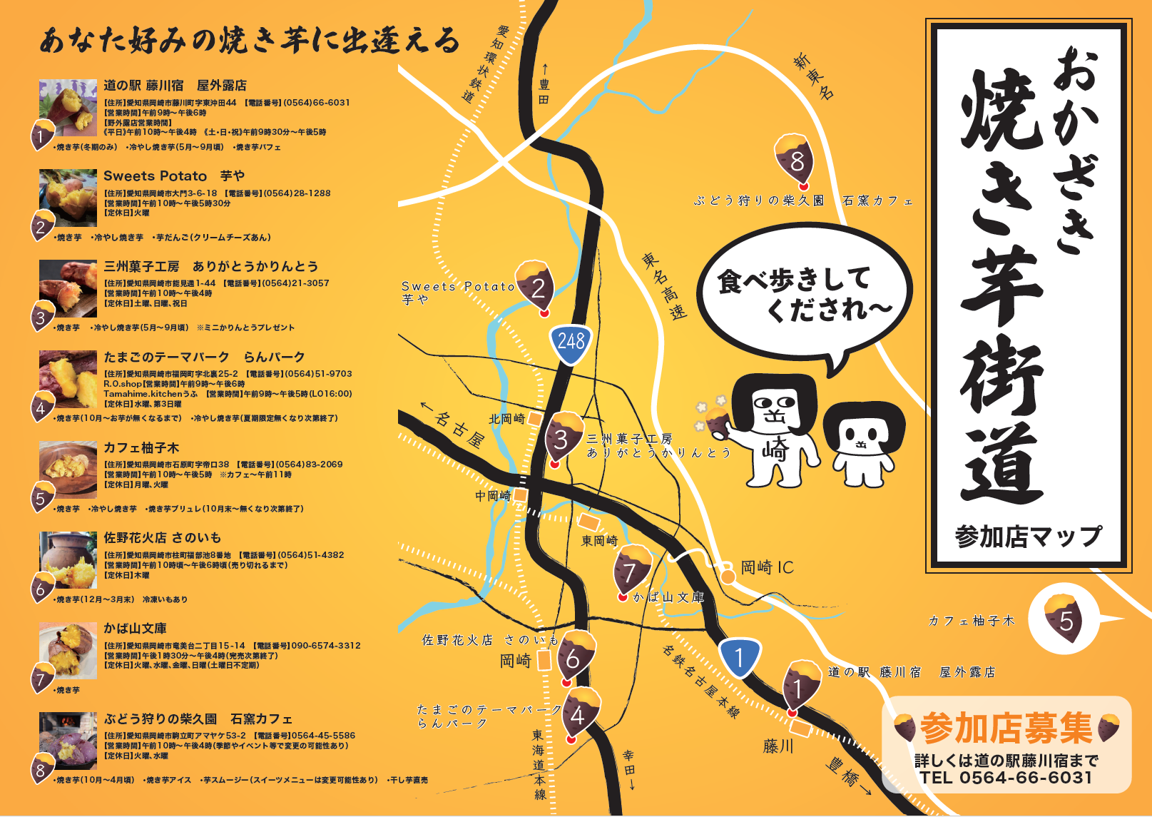 現在は、8店舗が熟成の仕方や焼き方を工夫しながらこだわり焼き芋を提供しています。岡崎を巡ってあなた好みの焼き芋を探してみてください!