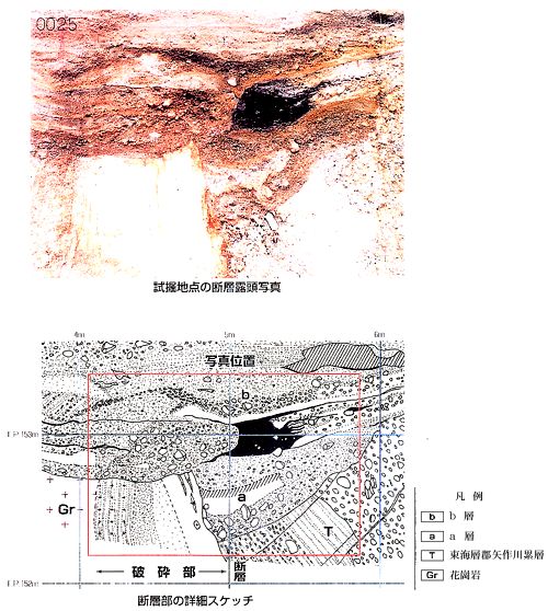 試堀地点の断層露頭写真、断層部の詳細スケッチ