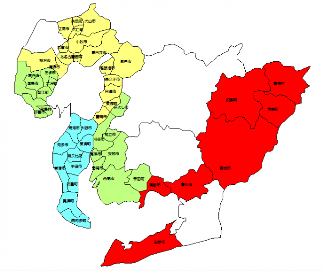 碧南市(18)、刈谷市(43)、安城市(47)、知立市(22)、高浜市(23)、みよし市(18)、西尾市(31)、幸田町(18) |