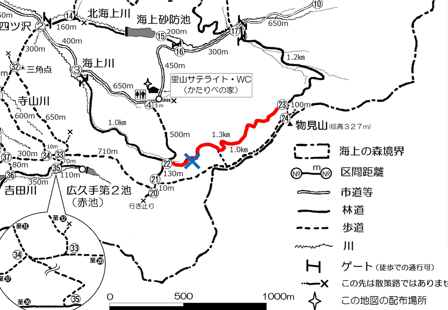 【注意情報】 道標17~23(物見山下~市道行止)において、道の崩落が確認されました。 危険ですので、通行はご遠慮ください。迂回をお願いいたします。 |