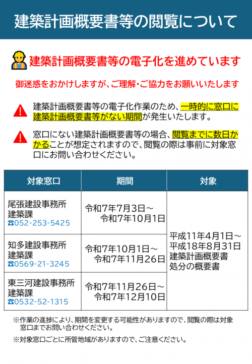 (注意)令和7年度より建築計画概要書等の電子化を進めております。一時的に窓口に建築計画概要書等がない期間が発生いたしますので、閲覧の際はご注意をお願いいたします。