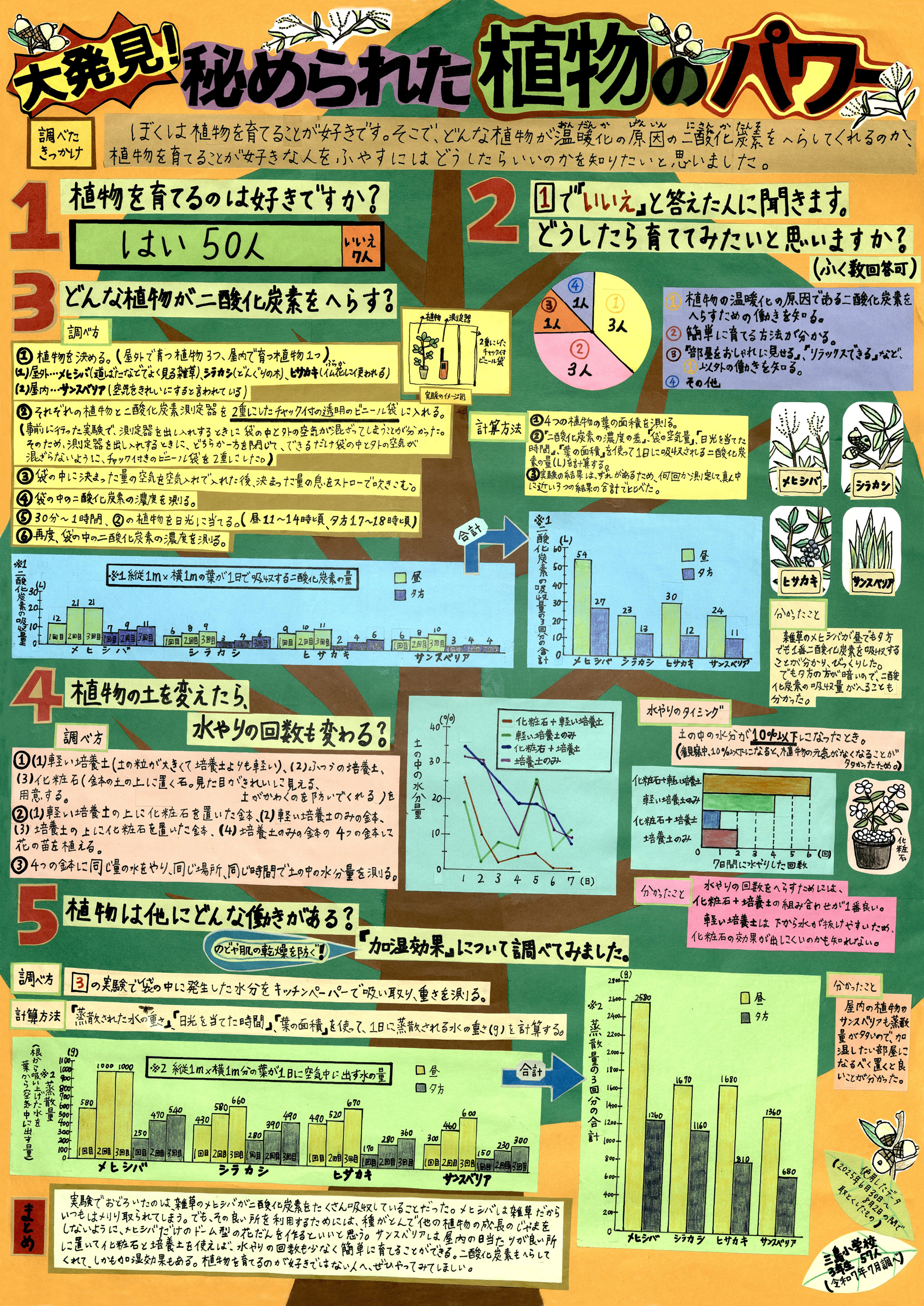 今、とても大きな問題になっている温暖化について、どんな植物がどういう働きをするのかを調べました。植物はいろいろなパワーをもっています。このパワーを生かせる方法を、これからも研究していきたいと思います。 |