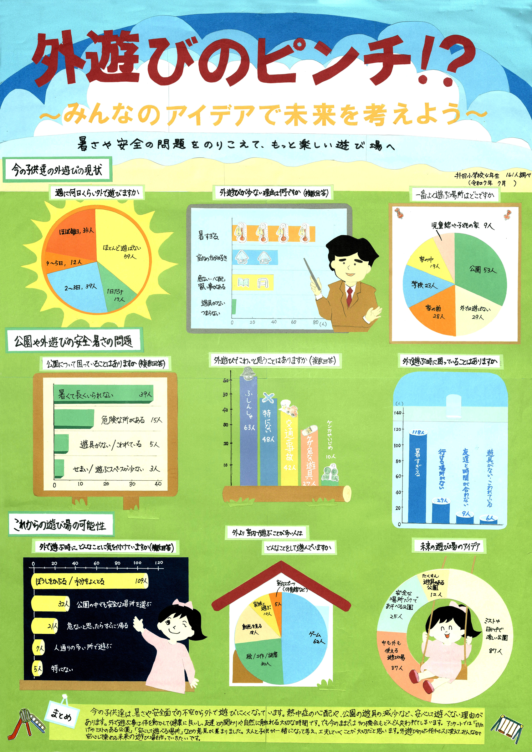 暑さで外遊びができない今の状況をテーマに、工夫や未来のアイデアを、アンケートで集めた点が良かったです。グラフのデザインも見やすく、内容に合った工夫がされていて、わかりやすい作品です。 |