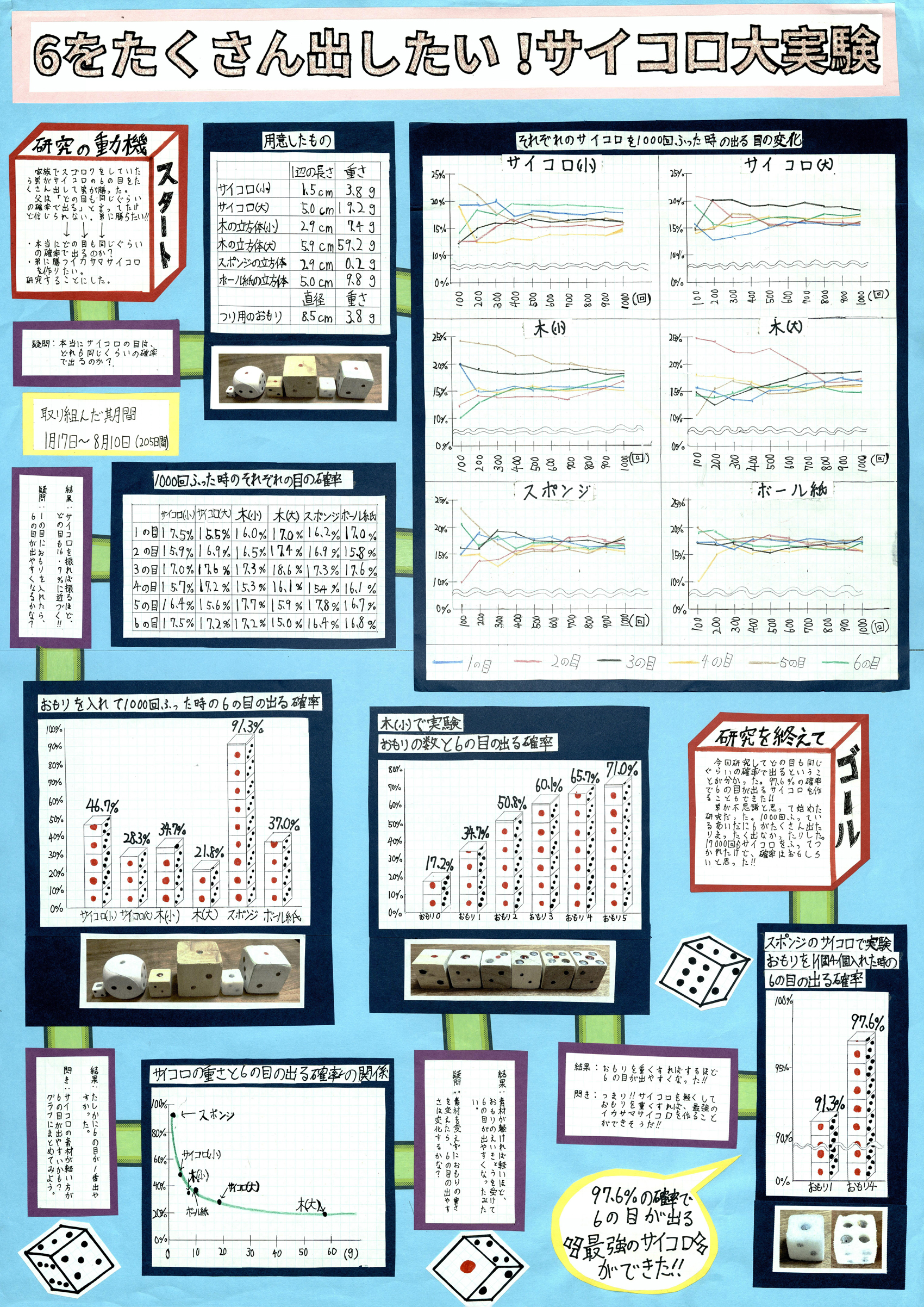 | 講評 | 自分の興味を深く追い続け、繰り返し実験した結果をすごろく形式で工夫してまとめています。目的に合うサイコロを作りたいという願いを、筋道を立てて論理的に表現しているところが、とても素晴らしい作品です。 | |