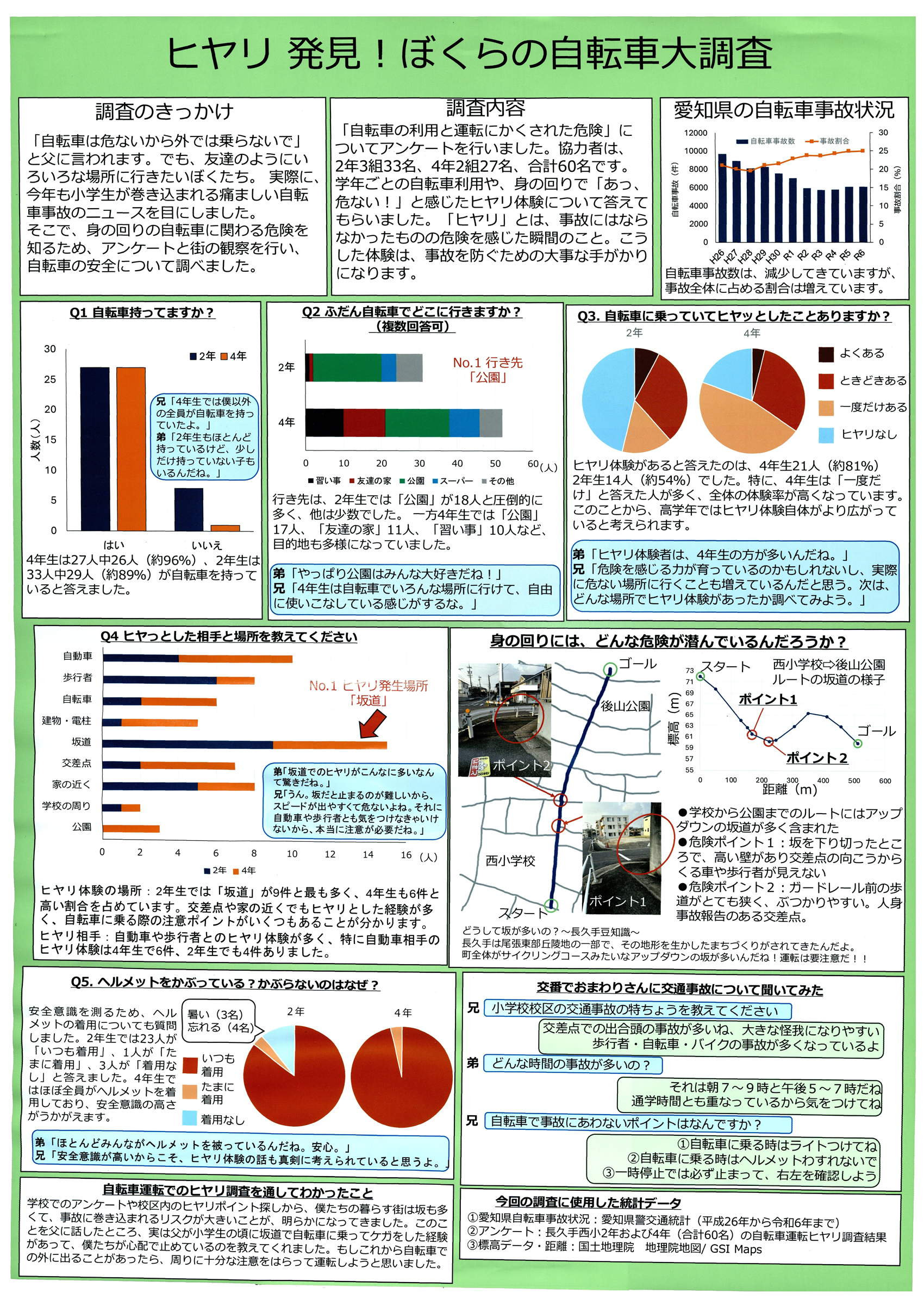 「どうして自転車は危ないの?」という疑問から、兄弟でアンケートやまちの調べを行いました。いろいろな“ヒヤリ”やまちの特徴との関係が見つかっておどろきました。安全に気をつける大切さがよくわかりました。 |