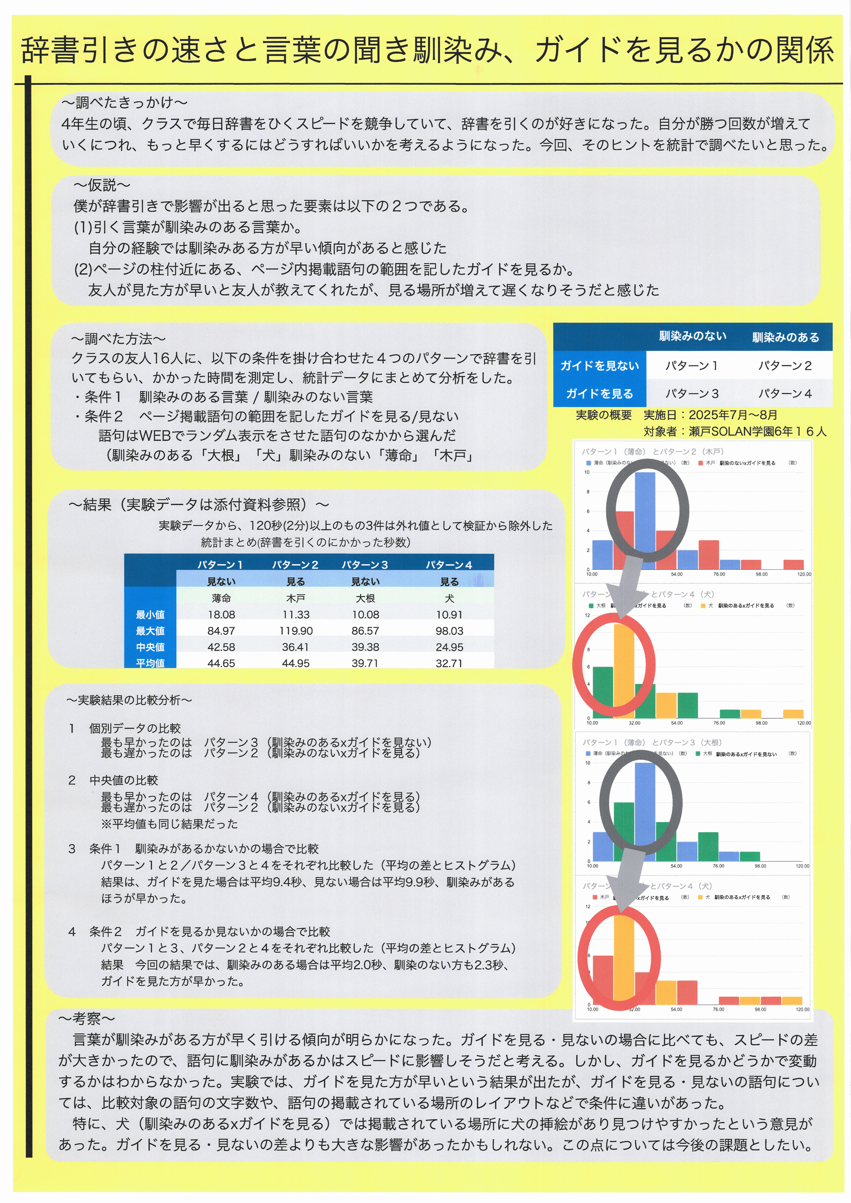 小学生とは思えない構成や工夫があり、ストーリーの流れに沿って内容が自然に伝わる作品です。地図や写真、グラフを効果的に使いながら、身近なテーマを丁寧に掘り下げている点も良いと思います。 |