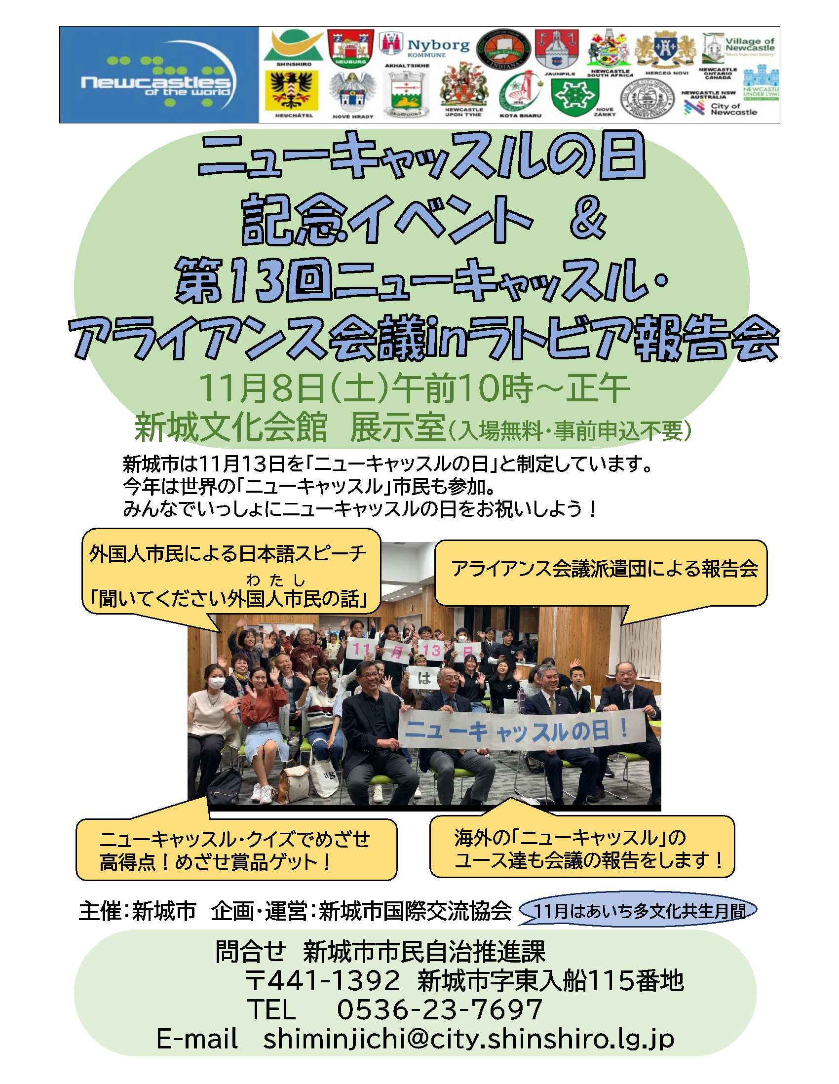 | その他 | 新城市は「新しい城」の名前を持つ世界16都市と「ニューキャッスル・アライアンス(同盟)」を結び交流しており、11月13日を「ニューキャッスルの日」と定めています。 この日を記念した本イベントでは、外国人市民による日本語スピーチ発表会のほかニューキャッスルに関するクイズ、8月に開催されたアライアンス会議の報告等を通じ、新城の名のもとに様々な人が集い、ともに在ること、つながることの大切さを確かめます。 |